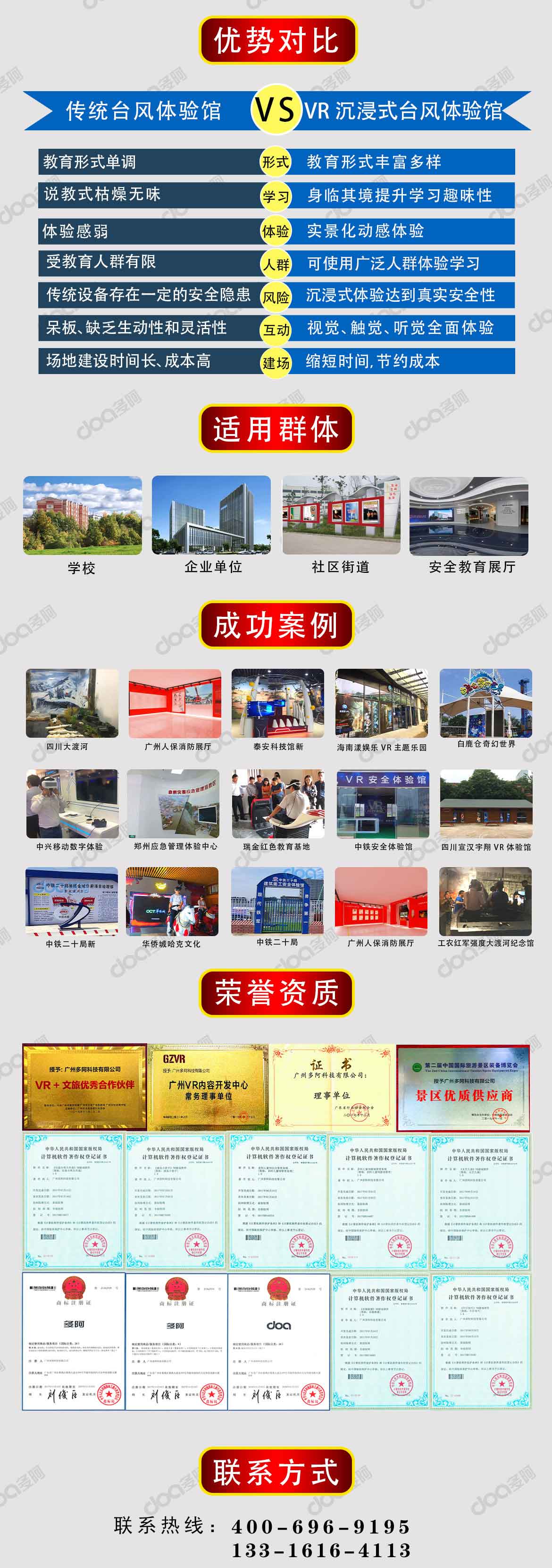 广州多阿科技有限公司(官网:www.vrdoa.com)成立于2016年,前身是一家VR游戏开发企业,现致力于数字化展厅软硬件开发与制作,主力开发虚拟现实技术,公司除现有VR党建主题展馆、VR军事馆、VR警务训练、VR教育、VR禁毒教育馆、VR消防体验馆、VR台风海啸馆、VR地震体验馆、VR建筑安全教育馆、VR文旅项目、VR安全教育等外,承接各种应用场景的VR软硬件与整体策划、定制、开发服务,与全国各地100+ 知名企业达成合作,项目制作经验丰富,是您VR合作的首选品牌。
